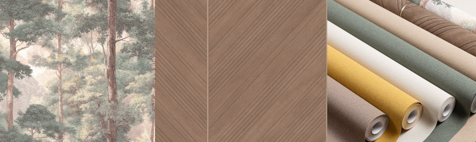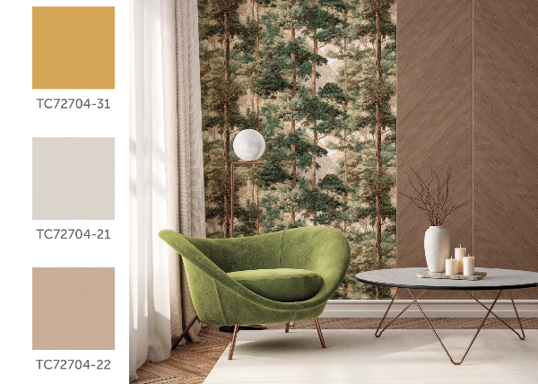 Главное преимущество — принцип мультисочетаемости. Вы можете взять обои с растительным рисунком леса и комбинировать их с более спокойными фактурными покрытиями из той же коллекции: