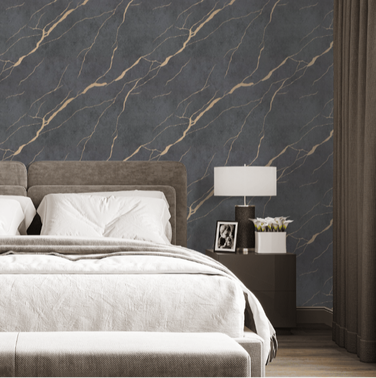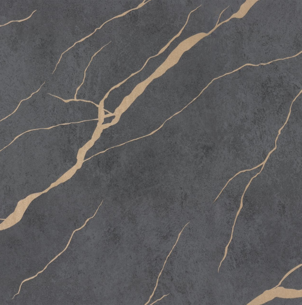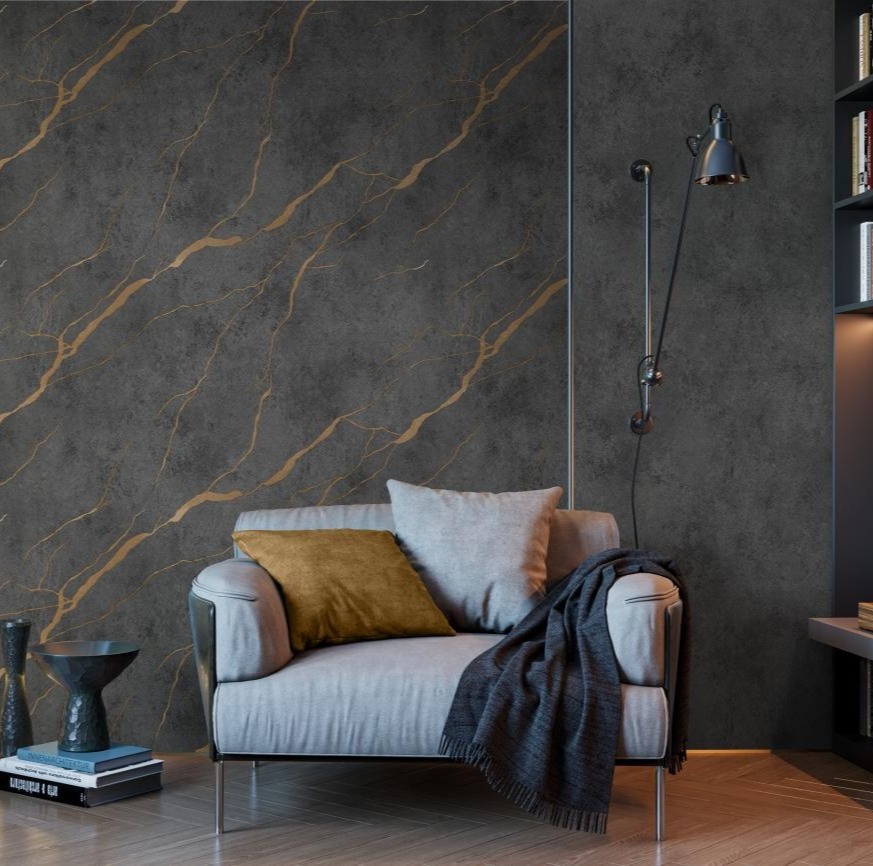 По бетонной текстуре струятся блестящие прожилки ювелирной потали, прорисованные с высокой точностью. Благодаря этому коллекция визуально напоминает обои под плитку из натурального мрамора с золотыми или серебряными вкраплениями. После поклейки полотна стыкуются ровно, образуя на стене единую бесшовную мраморную поверхность.